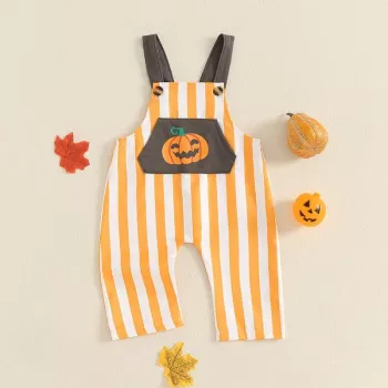 Baby Halloween Striped Pumpkin Overalls with Front Pocket – Unisex Sleeveless Jumpsuit