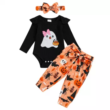 Baby Girl Halloween 3-Piece Outfit Romper Pants Bow Headband Set